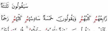 س ي ق ول ون ث ل اث ة ر اب ع ه م ك ل ب ه م و ي ق ول ون خ م س ة س اد س ه م ك ل ب ه م ر ج م ا ب ال غ ي ب و ي ق ول ون س ب ع ة و ث ام ن ه م ك ل ب ه م ق ل ر ب ي أ ع ل م ب ع د ت ه م م ا ي ع ل م ه م إ ل ا ق ل يل ف ل ا ت م ار ف يه م